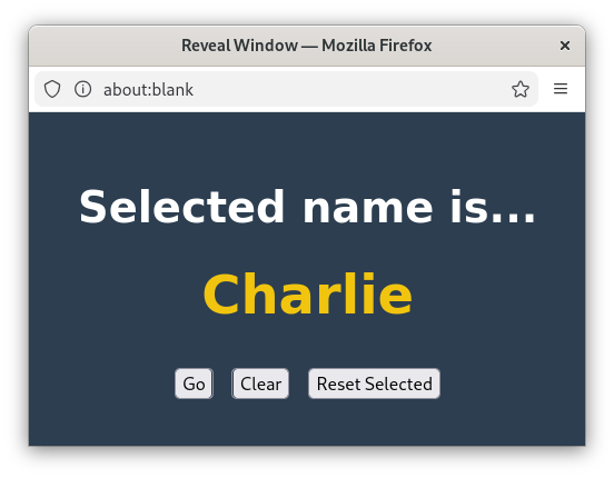 - Seperate 'Reveal' window displays selected name. Intended for use with 2 screens.